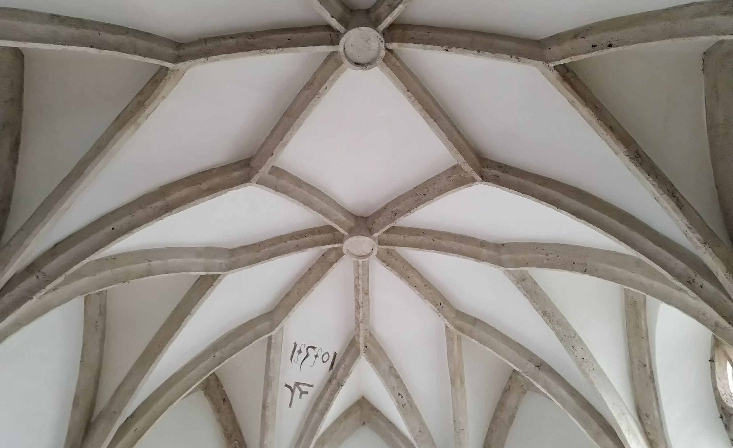 Fünf von ihnen sind mit Schildchen geschmückt. Im geraden Mittelteil des Chorabschlusses und in der rechten Chorwand befinden sich zwei grosse Spitzbogenfenster mit Fischblasenmasswerken, Mittelstützen und weisser Rautenverglasung. In einem Feld der Chordecke steht das Baudatum 1501 und darunter das Meisterzeichen von Andreas Bühler. Der Chor ist von einem Brüsttäfer umgeben. Der hintere Chorbodenteil ist aus Holz. Der vordere Chorbodenteil ist mit gefugten Steinplatten belegt, auf welchen der achteckige Abendmahlstisch von 1811 steht. An der linken Chorwand ist ein Steinbalken mit der eingehauenen Inschrift: 17 IF 23 zu sehen. Darunter sind die Renovationsdaten aufgemalt. Das Schiff ist mit einer flachen Kassettendecke in 30 Feldern aus Rundprofilen bedeckt. An der seiner rechten Wand befindet sich ein breites Spitzbogenfenster in gleicher Ausführung wie die Chorfenster. An der linken Chorschulterwand steht auf einem Holzfuss die Kanzel aus Nussbaumholz. Der Korpus wird von fünf umschlungenen Halbsäulen in Felder geteilt, deren Flöchen mit Muscheln bekrönt sind. Der Schalldeckel ist kassettiert. An der der rechten Chorschulterwand steht vor dem zugemauerten alten Turmeingang die Orgel von Metzler Diekon/Felsberg. Sie wurde in den Jahren 1973 und 1988 revidiert. Das Schiff ist von einem Brusttäfer umgeben. An der Westseite befindet sich das Portal mit einem Windfang. Der Mittelgang ist mit gefugten Natursteinplatten belegt. Ihm zur Seite stehen auf Holzunterlagen insgesamt 22 Bänke. Das zweiflüglige Portal besitzt ein spitzbogiges Gewand aus Tuffstein, das von einem geschindelten Satteldach geschützt wird. Die Fassade der Kirche sind hell verputzt, die Kanten mit Sgrafittoquadern verziert und die Fensterleibungen weiss ausgemalt. Im Giebelfeld der Kirchenfront sieht man ein rundes Lüftungsfenster und die Jahreszahl 1723. Das über dem Chor abgewalmte Satteldach ist mit kleinen Eternitplatten belegt. Der Turm ist auf der Südseite an das Schiff angebaut. Er besitzt einen eigenen Eingang. Am glatten Schaft befinden sich oben vier rundbogige Schallfenster. Der Turm hat einen spitzen achteckigen Helm mit Bruch, der mit Kugel, Kreuz und Wetterhahn bekrönt ist. In der Glockenstube, die über eine eiserner Wendeltreppe bestiegen wird, hängen in einem Gestell aus Winkeleisen drei elektrisch angetriebene Glocken.